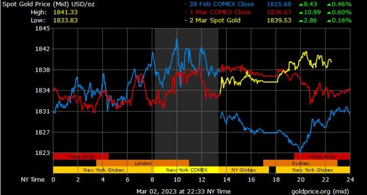 Giá vàng tương lai giao tháng 4/2023 trên sàn Comex New York giảm 4,9 USD xuống 1.840,5 USD/ounce.
