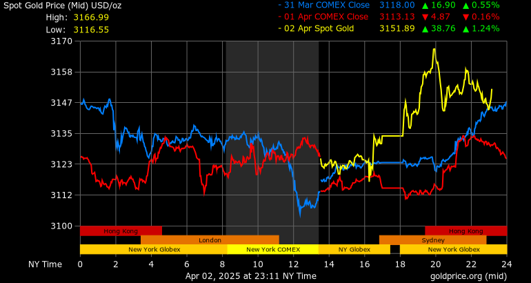 Giá vàng tương lai giao tháng 6/2025 trên sàn Comex New York tăng 20,2 USD, tương ứng tăng 0,64% lên mức 3.166,2 USD/ounce.