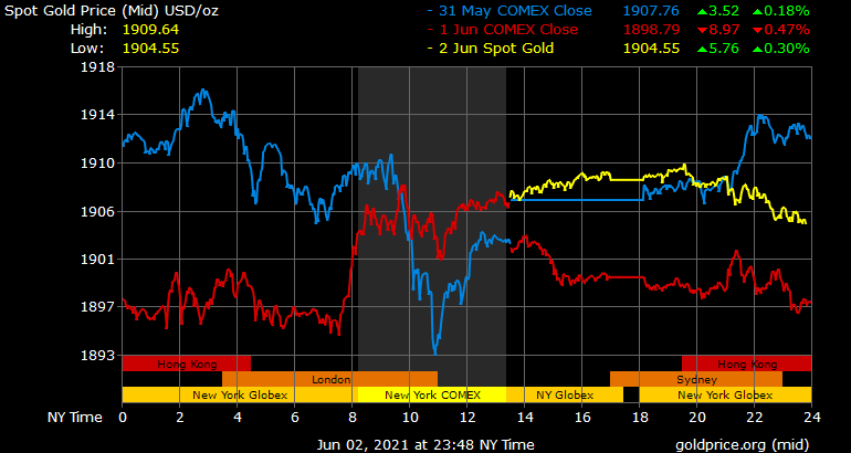 Giá vàng tương lai giao tháng 7 trên sàn Comex New York giảm 2,6 USD xuống 1.906,1 USD/ounce.