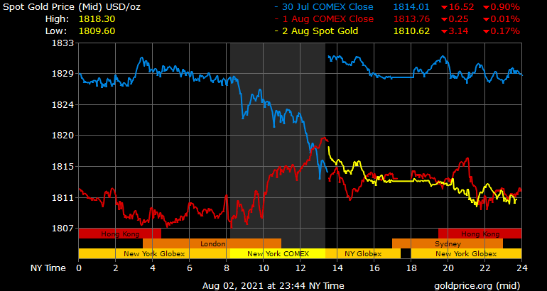 Giá vàng tương lai giao tháng 9 trên sàn Comex New York giảm 8,4 USD xuống 1.810,3 USD/ounce.