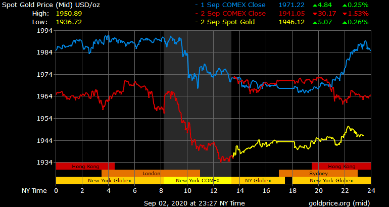 Trên thị trường vàng thế giới, giá vàng giao ngay chốt phiên đêm qua tại Mỹ giảm 26,7 USD xuống 1.943,1 USD/ounce. Sang phiên châu Á sáng nay, giá vàng tăng trở lại lên 1.945 USD/ounce. Giá vàng tương lai giao tháng 10 trên sàn Comex New York tăng 7,9 USD lên 1.944,8 USD/ounce.