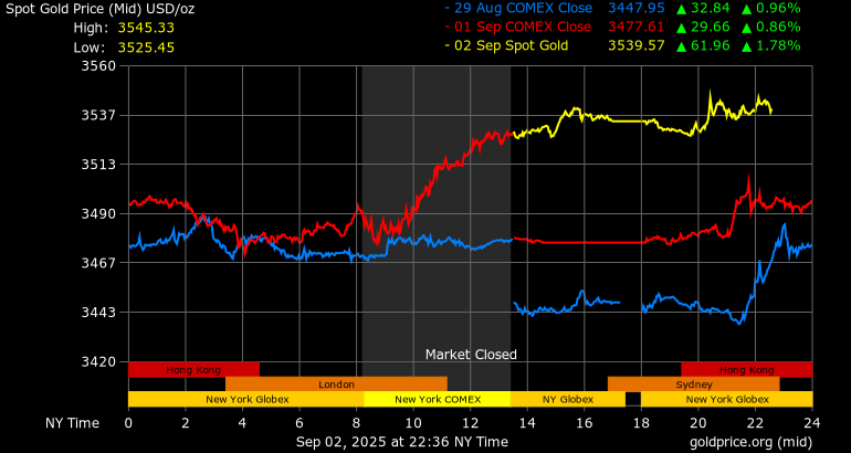 Trên thị trường vàng thế giới, giá vàng giao ngay chốt phiên hôm qua tại Mỹ tăng 57,2 USD lên mức 3.533,5 USD/ounce. Sang phiên châu Á sáng nay, giá vàng tiếp tục tăng 6,8 USD lên 3.540,4 USD/ounce.
