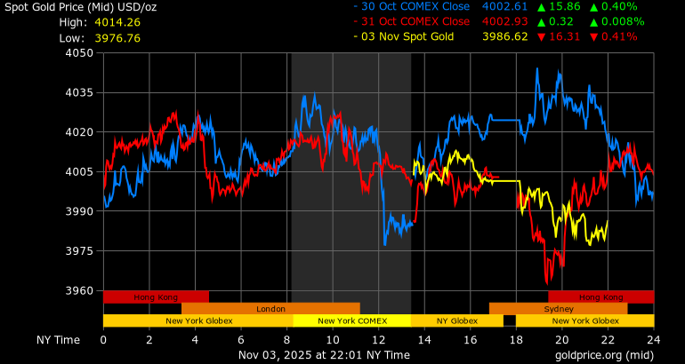 Trên thị trường vàng thế giới, giá vàng giao ngay chốt phiên hôm qua tại Mỹ giảm 1,2 USD, tương ứng giảm 0,03% xuống mức 4.001,6 USD/ounce. Sang phiên châu Á sáng nay, giá vàng tiếp tục giảm 13,9 USD xuống 3.987,7 USD/ounce.