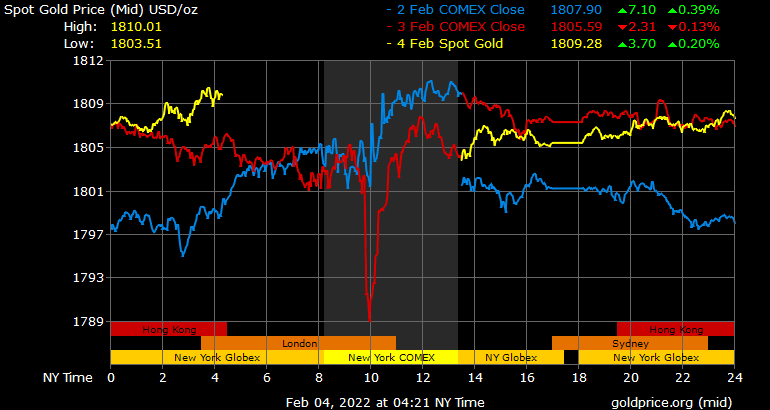 Giá vàng tương lai giao tháng 3/2022 trên sàn Comex New York tăng 6 USD lên 1.809,2 USD/ounce.
