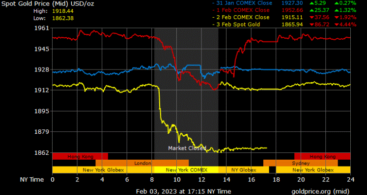 (ĐTCK) Vàng thế giới đã có phiên lao dốc mạnh về dưới mốc 1.870 USD/ounce ngay sau báo cáo việc làm tháng 1 đáng kinh ngạc của Hoa Kỳ với tỷ lệ thất nghiệp giảm xuống 3,4% - mức thấp nhất kể từ năm 1969.