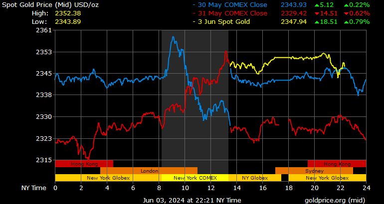 Giá vàng tương lai giao tháng 8/2024 trên sàn Comex New York tăng 23,5 USD, tương ứng tăng 1% lên mức 2.369,3 USD/ounce.