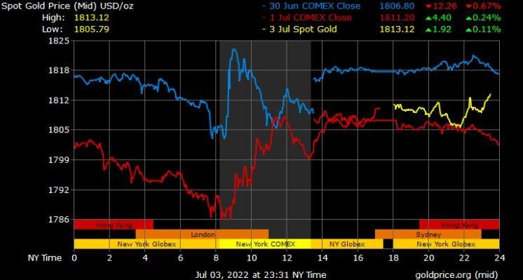 Giá vàng tương lai giao tháng 8/2022 trên sàn Comex New York giảm 5,8 USD xuống 1.801,5 USD/ounce.