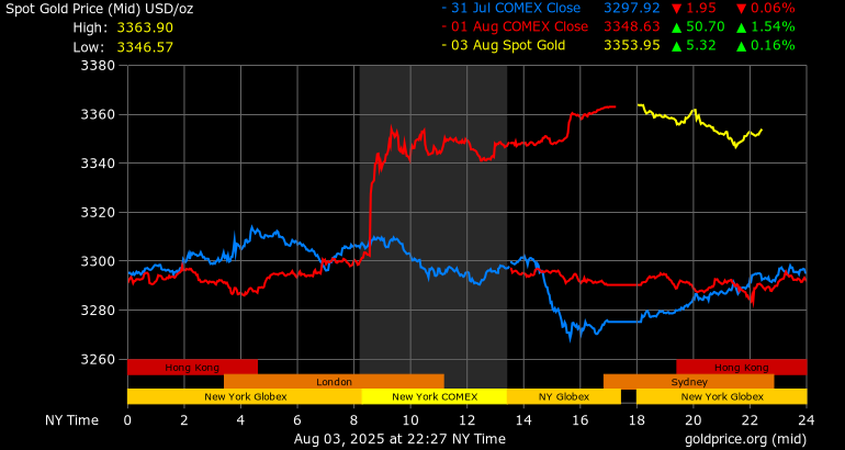 Trên thị trường vàng thế giới, giá vàng giao ngay chốt phiên cuối tuần qua tại Mỹ tăng mạnh 72,8 USD lên mức 3.362,9 USD/ounce. Sang phiên châu Á sáng nay, giá vàng đảo chiều giảm 8,2 USD xuống 3.354,7 USD/ounce.