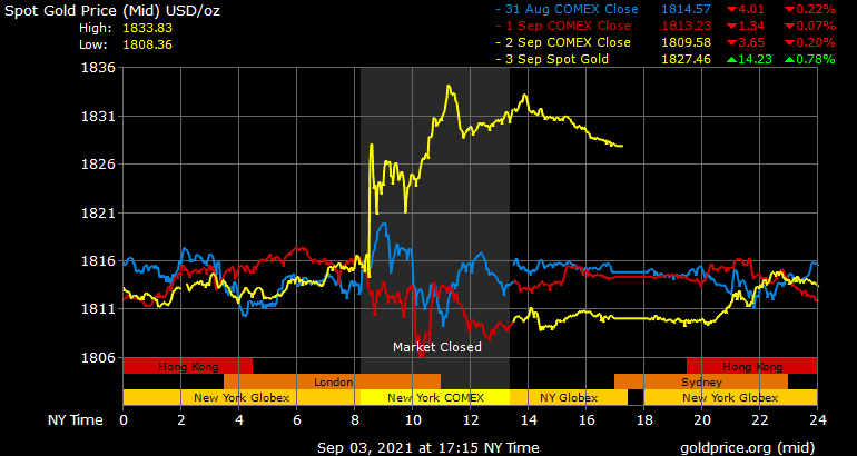 Trên thị trường vàng thế giới, giá vàng giao ngay chốt phiên đêm qua tại Mỹ tăng 18 USD lên 1.827,6 USD/ounce. Giá vàng tương lai giao tháng 10 trên sàn Comex New York tăng 18,3 USD lên 1.827,7 USD/ounce.