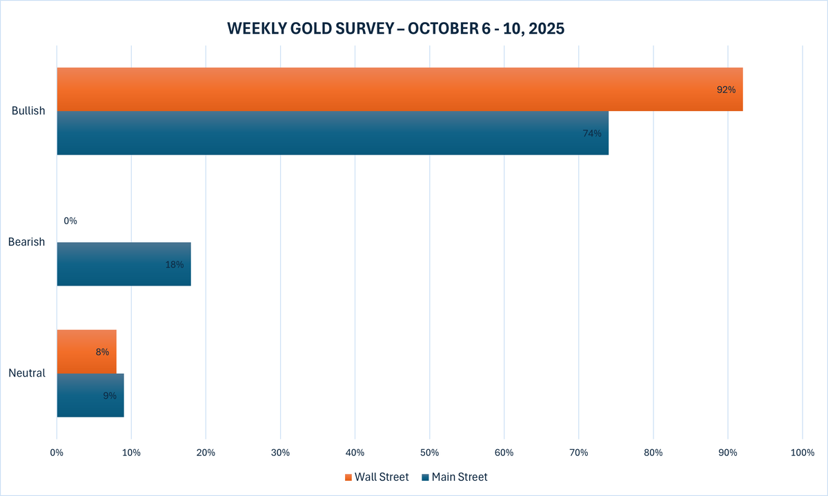 Cuộc khảo sát vàng hàng tuần mới nhất của Kitco News cho thấy Phố Wall vẫn lạc quan hơn bao giờ hết sau một màn trình diễn nổi bật khác, trong khi các nhà đầu tư Main Street cũng ngày càng lạc quan về tiềm năng tăng giá của kim loại quý này vào tuần tới.
