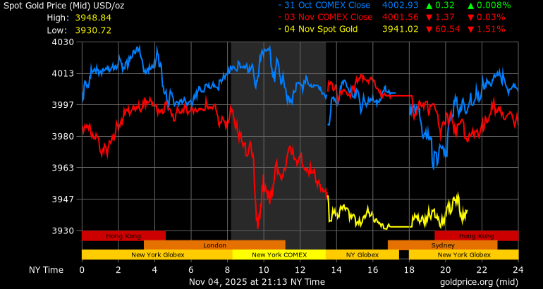 Trên thị trường vàng thế giới, giá vàng giao ngay chốt phiên hôm qua tại Mỹ giảm 69,5 USD, tương ứng giảm 1,74% xuống mức 3.932,1 USD/ounce. Sang phiên châu Á sáng nay, giá vàng đảo chiều tăng 8,9 USD lên 3.941 USD/ounce.