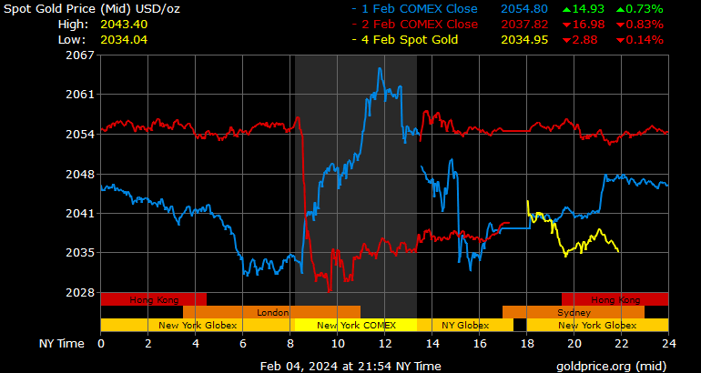 Trên thị trường vàng thế giới, giá vàng giao ngay chốt phiên cuối tuần qua tại Mỹ giảm 15,1 USD xuống 2.039,7 USD/ounce. Sang phiên châu Á sáng nay, giá vàng tiếp tục giảm 5,6 USD xuống 2.034,1 USD/ounce.