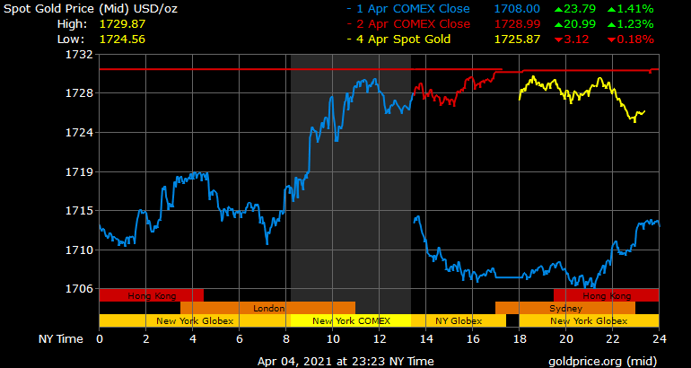 Thị trường Mỹ nghỉ giao dịch vàng trong ngày thứ Sáu Tuần Thánh. Giá vàng thế giới ngày thứ Năm trước đó đã tăng hơn 20 USD/ounce nhờ lợi suất trái phiếu Mỹ kỳ hạn 10 năm giảm nhanh về còn 1,68%, sau khi chạm đỉnh 14 tháng vào tuần trước đó.