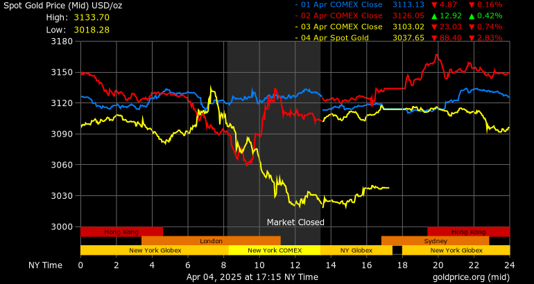 Giá vàng tương lai giao tháng 6/2025 trên sàn Comex New York giảm mạnh 86,3 USD, tương ứng giảm 2,76% xuống mức 3.035,4 USD/ounce.