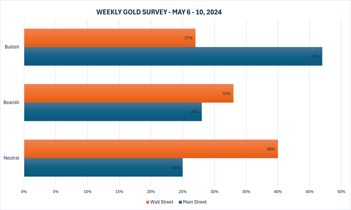 Trong khi đó, 217 phiếu bầu đã được bỏ trong cuộc thăm dò trực tuyến của Kitco, chỉ một số ít nhà đầu tư trên Main Street kỳ vọng giá sẽ tăng cao hơn trong thời gian tới. 102 nhà giao dịch bán lẻ, chiếm 47%, kỳ vọng vàng sẽ tăng vào tuần tới. 61 người khác, tương đương 28%, dự đoán giá sẽ thấp hơn, trong khi 54 người được hỏi, tương đương 25%, kỳ vọng kim loại quý sẽ có xu hướng đi ngang trong tuần tới.