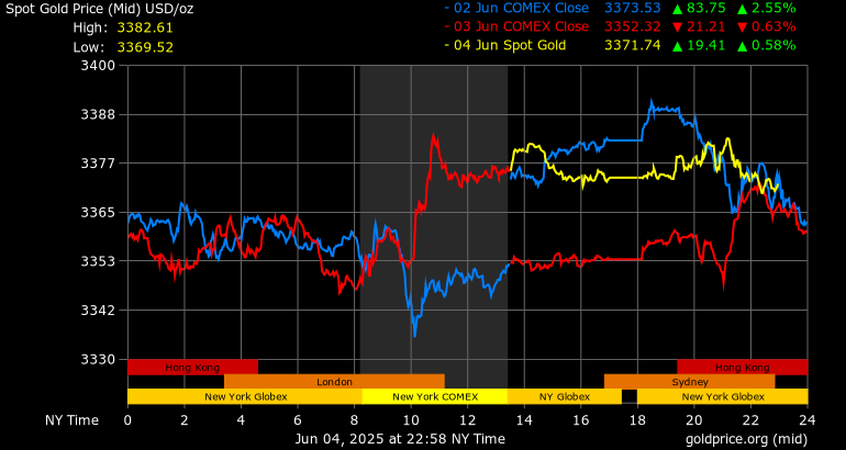 Trên thị trường vàng thế giới, giá vàng giao ngay chốt phiên hôm qua tại Mỹ tăng 19,1 USD lên mức 3.372,5 USD/ounce. Sang phiên châu Á sáng nay, giá vàng đảo chiều giảm nhẹ 1,8 USD xuống 3.370,7 USD/ounce.