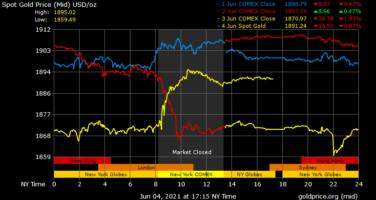 Trên thị trường vàng thế giới, giá vàng giao ngay chốt phiên đêm qua tại Mỹ tăng 21,2 USD lên 1.892 USD/ounce. Giá vàng tương lai giao tháng 7 trên sàn Comex New York tăng 21 USD lên 1.893,3 USD/ounce.