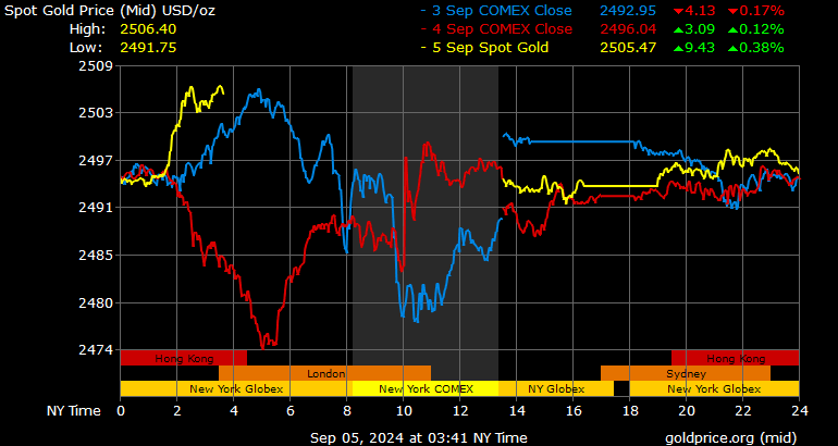 Trên thị trường vàng thế giới, giá vàng giao ngay chốt phiên hôm qua tại Mỹ tăng 2,6 USD lên 2.495,5 USD/ounce. Sang phiên châu Á sáng nay, giá vàng tiếp tục tăng 10,8 USD lên 2.506,3 USD/ounce.