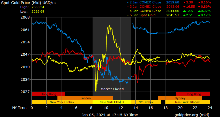 Giá vàng tương lai giao tháng 2/2024 trên sàn Comex New York giảm 0,2 USD, tương ứng giảm 0,01% xuống 2.049,8 USD/ounce.