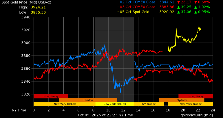 Trên thị trường vàng thế giới, giá vàng giao ngay chốt phiên cuối tuần qua tại Mỹ tăng 29,9 USD, tương ứng tăng 0,78% lên mức 3.886,5 USD/ounce. Sang phiên châu Á sáng nay, giá vàng tiếp tục tăng 36 USD lên 3.922,4 USD/ounce.