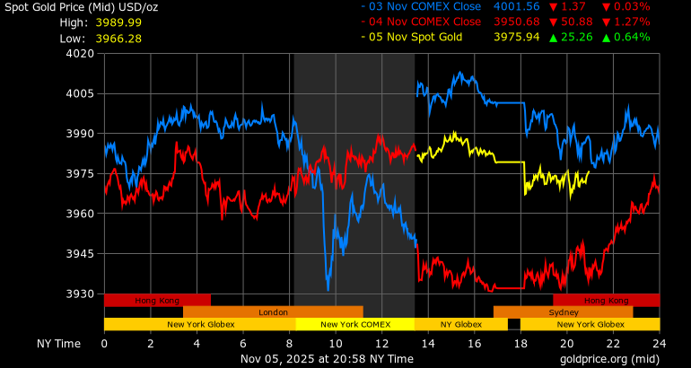 Giá vàng tương lai giao tháng 12/2025 trên sàn Comex New York tăng 32,4 USD, tương ứng tăng 0,82% lên mức 3.992,9 USD/ounce.