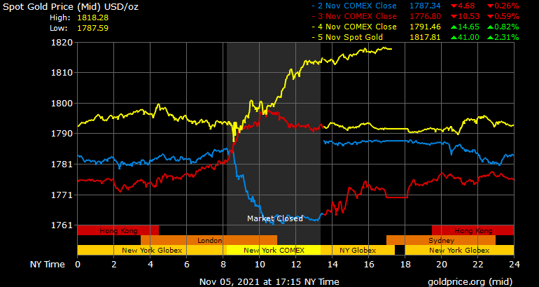 Giá vàng thế giới phiên ngày thứ Sáu tăng vọt, sau khi giới phân tích cho thấy việc Fed bắt đầu cắt giảm chương trình mua tài sản hàng tháng là dấu hiệu của lạm phát đến sớm đã kích thích dòng tiền chảy vào vàng.