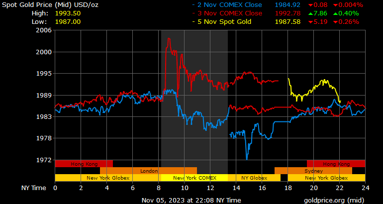 Giá vàng tương lai giao tháng 12/2023 trên sàn Comex New York tăng 5,7 USD, tương ứng tăng 0,28% lên 1.999,2 USD/ounce.
