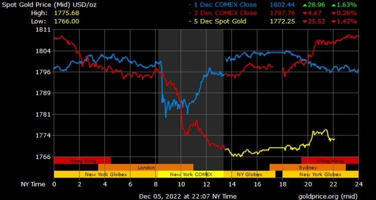 Giá vàng tương lai giao tháng 12/2022 trên sàn Comex New York giảm 28,3 USD xuống mức 1.781,3 USD/ounce.