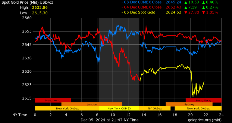Giá vàng tương lai giao tháng 2/2025 trên sàn Comex New York giảm mạnh 27,8 USD, tương ứng giảm 1,04% xuống mức 2.648,4 USD/ounce.