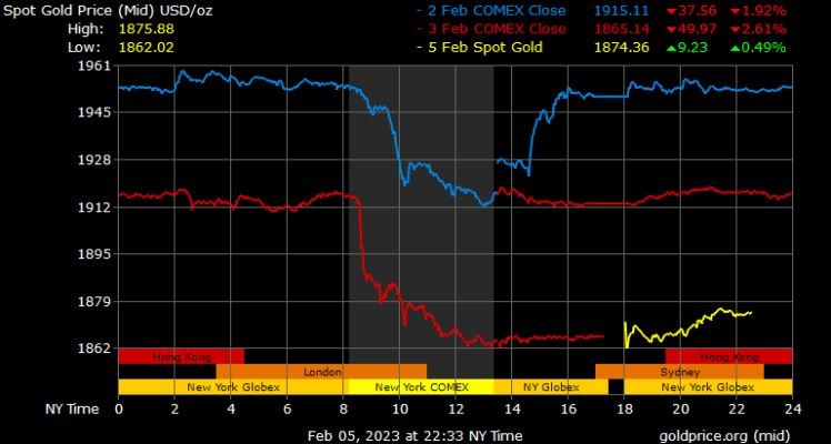 Giá vàng tương lai giao tháng 4/2023 trên sàn Comex New York giảm 54,2 USD xuống 1.876,6 USD/ounce.