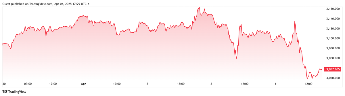 Giá vàng tương lai giao tháng 6/2025 trên sàn Comex New York giảm mạnh 86,3 USD, tương ứng giảm 2,76% xuống mức 3.035,4 USD/ounce. Tính chung cả tuần, giá vàng giao ngay giảm 78,9 USD/ounce, tương ứng giảm 2,53%.