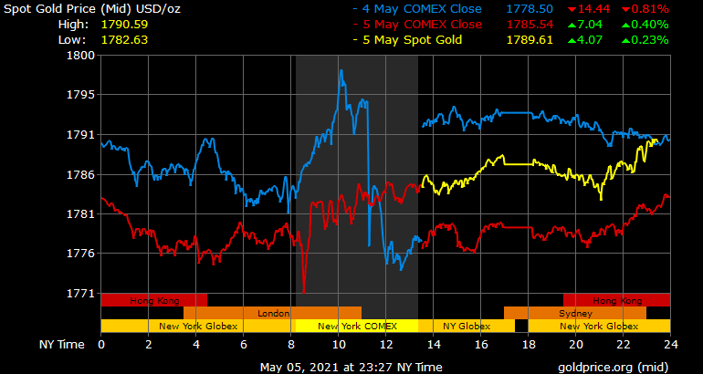 Giá vàng tương lai giao tháng 6 trên sàn Comex New York tăng 5 USD lên 1.789,3 USD/ounce.