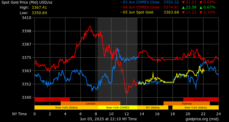 Giá vàng tương lai giao tháng 8/2025 trên sàn Comex New York giảm 24,1 USD, tương ứng giảm 0,71% xuống mức 3.375,1 USD/ounce.