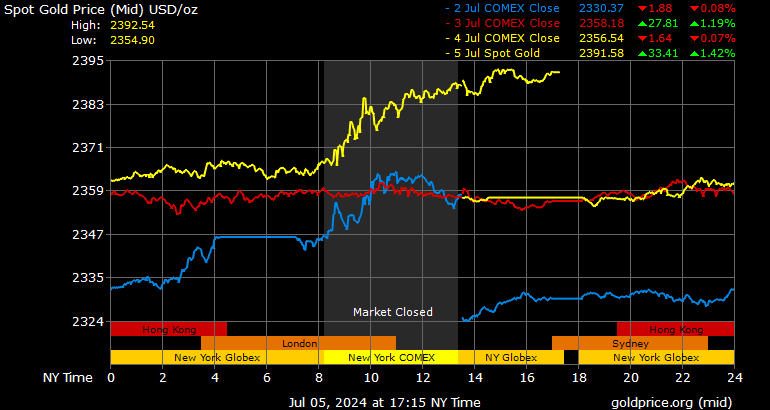 Giá vàng tương lai giao tháng 8/2024 trên sàn Comex New York tăng 28,3 USD, tương ứng tăng 1,19% lên mức 2.397,7 USD/ounce.
