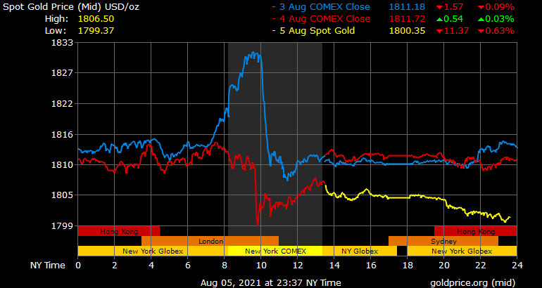 Giá vàng tương lai giao tháng 9 trên sàn Comex New York giảm 6,9 USD xuống 1.798,8 USD/ounce.