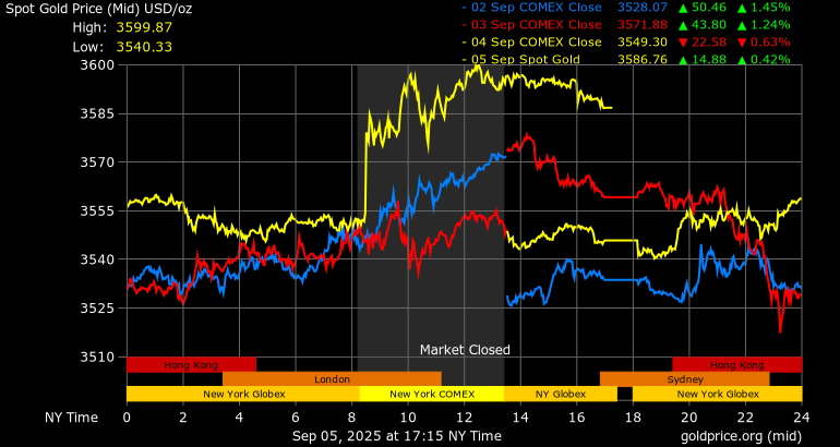 Trên thị trường vàng thế giới, giá vàng giao ngay chốt phiên hôm qua tại Mỹ tăng 40,7 USD, tương ứng tăng 1,15% lên mức 3.586,5 USD/ounce.
