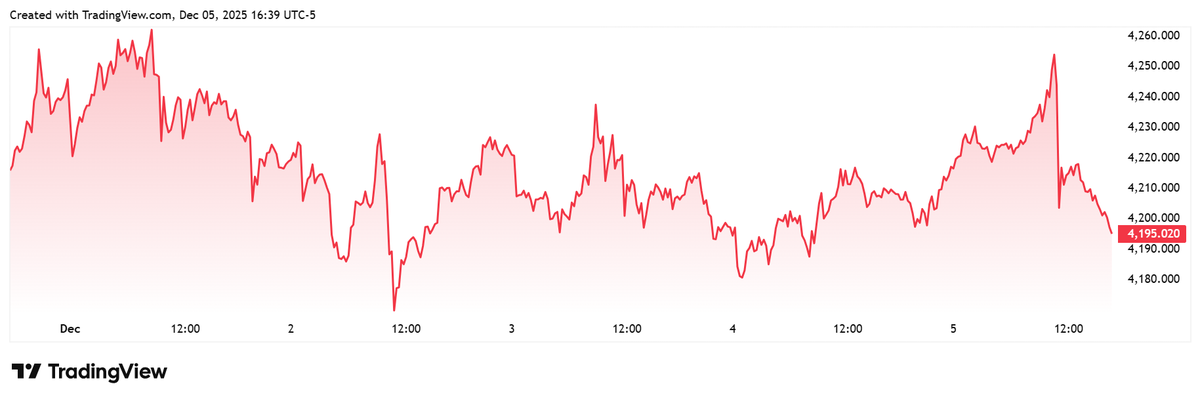 Trên thị trường vàng thế giới, giá vàng giao ngay chốt phiên hôm qua tại Mỹ giảm 10,1 USD, tương ứng giảm 0,24% xuống mức 4.198,7 USD/ounce.