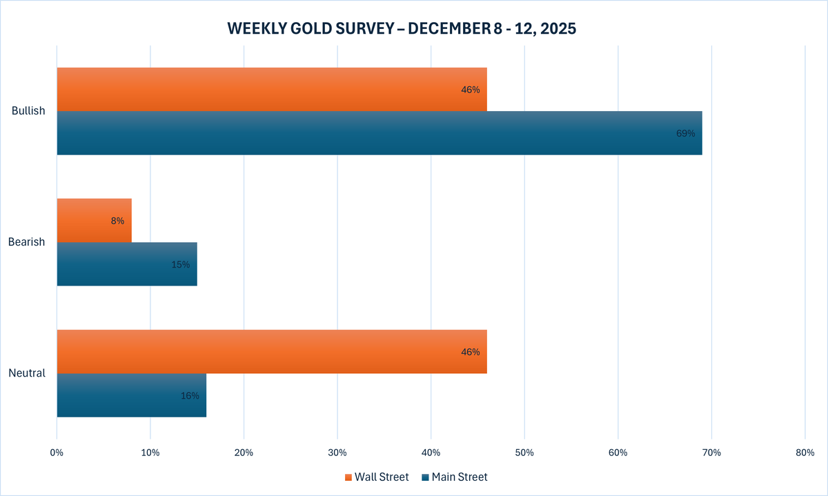 Khảo sát vàng hàng tuần mới nhất của Kitco News cho thấy tâm lý của Phố Wall chia đều giữa quan điểm lạc quan và trung lập, trong khi các nhà đầu tư Main Street hầu như không thay đổi trong đa số quan điểm lạc quan.