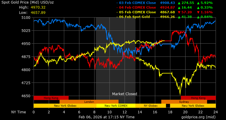 Trên thị trường vàng thế giới, giá vàng giao ngay chốt phiên hôm qua tại Mỹ tăng mạnh 183,9 USD, tương ứng tăng 3,85% lên mức 4.964,6 USD/ounce.