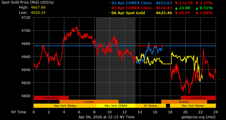 Trên thị trường vàng thế giới, giá vàng giao ngay chốt phiên hôm qua tại Mỹ giảm 26,8 USD, tương ứng giảm 0,57% xuống mức 4.650 USD/ounce. Sang phiên châu Á sáng nay, giá vàng tiếp tục giảm 19,9 USD xuống mức 4.630,1 USD/ounce.
