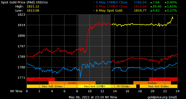Giá vàng tương lai giao tháng 6 trên sàn Comex New York tăng 4,1 USD lên 1.819,8 USD/ounce.