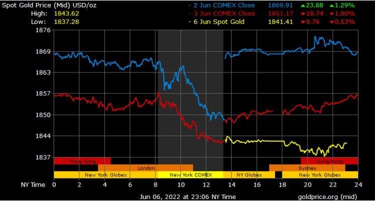 Giá vàng tương lai giao tháng 8/2022 trên sàn Comex New York giảm 6,5 USD xuống mức 1.843,7 USD/ounce.
