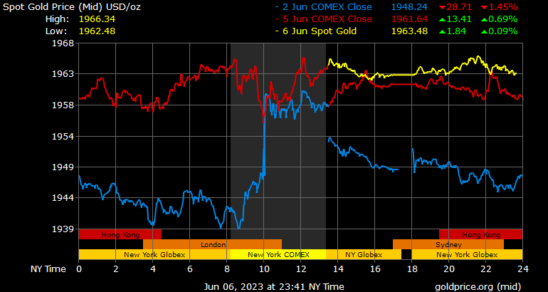 Giá vàng tương lai giao tháng 8/2023 trên sàn Comex New York tăng 7,2 USD, tương ứng tăng 0,36% lên 1.981,5 USD/ounce.