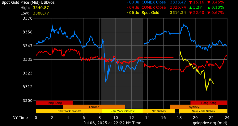 Trên thị trường vàng thế giới, giá vàng giao ngay chốt phiên cuối tuần qua tại Mỹ tăng 10,6 USD lên mức 3.336,6 USD/ounce. Sang phiên châu Á sáng nay, giá vàng đảo chiều giảm 23,1 USD xuống 3.313,5 USD/ounce.