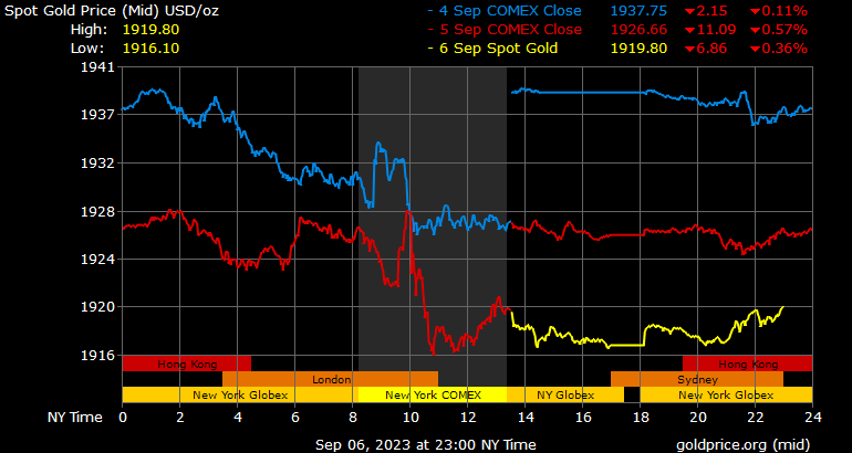 Giá vàng tương lai giao tháng 12/2023 trên sàn Comex New York giảm 8,4 USD, tương ứng giảm 0,43% xuống 1.944,2 USD/ounce.