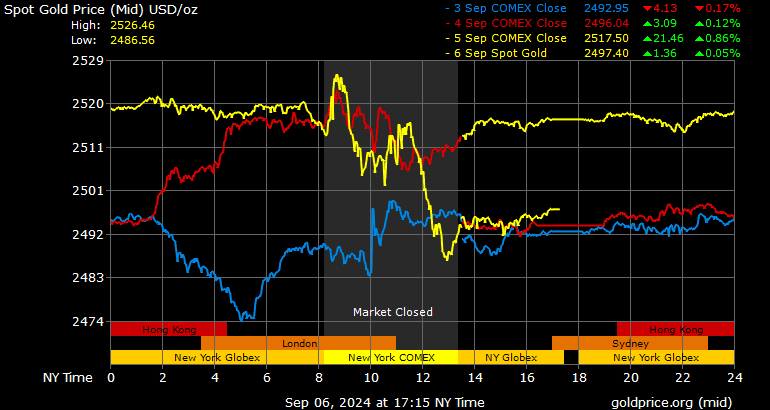 Trên thị trường vàng thế giới, giá vàng giao ngay chốt phiên hôm qua tại Mỹ giảm 19,3 USD xuống 2.497,6 USD/ounce.