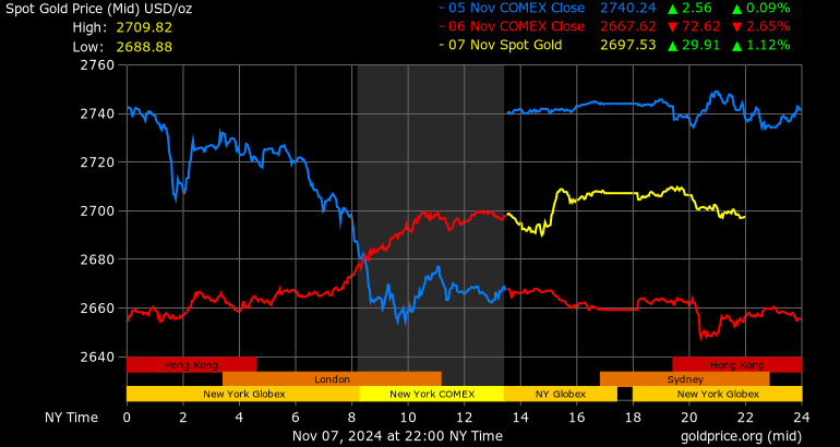 Trên thị trường vàng thế giới, giá vàng giao ngay chốt phiên hôm qua tại Mỹ tăng 47,7 USD lên 2.706,8 USD/ounce. Sang phiên châu Á sáng nay, giá vàng đảo chiều giảm 8,8 USD xuống 2.698 USD/ounce.