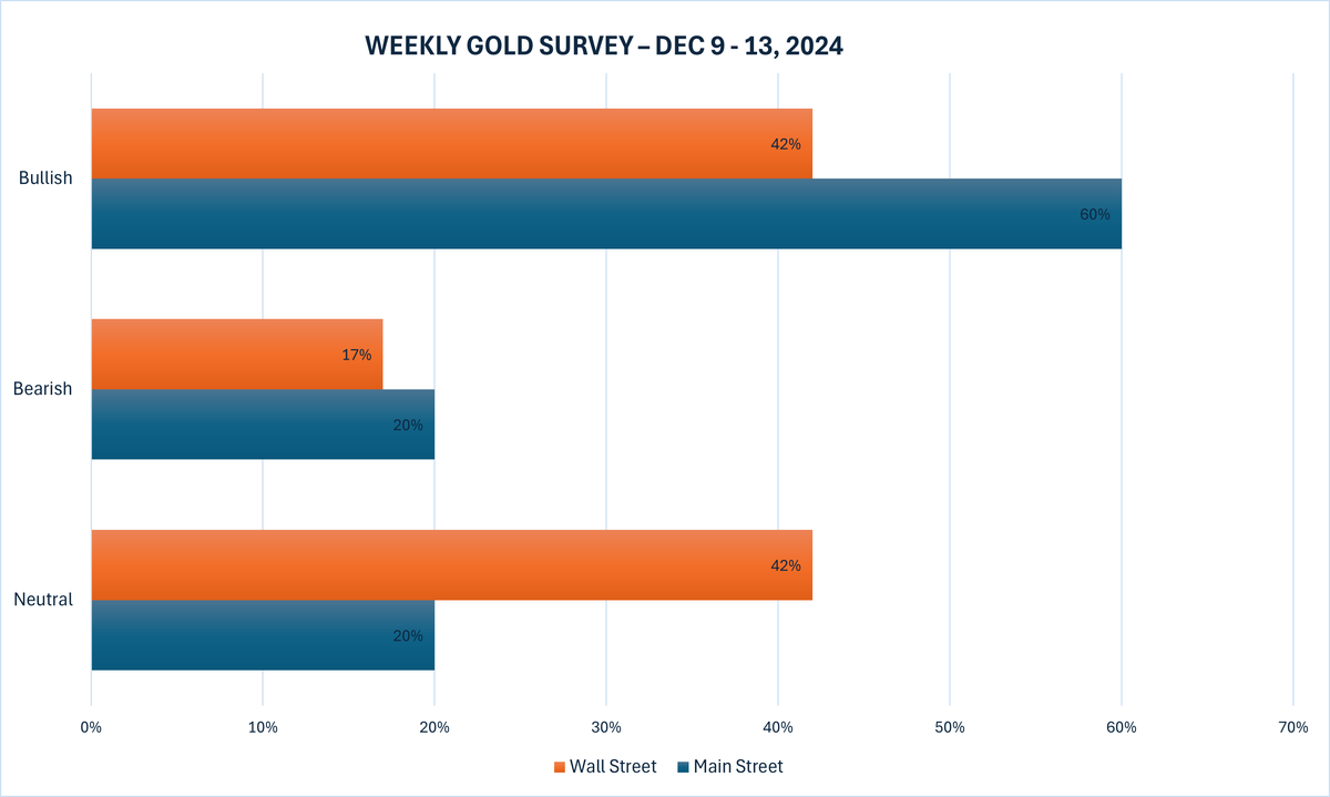 Tuần này, 12 nhà phân tích đã tham gia Khảo sát Vàng của Kitco News, với tâm lý Phố Wall một lần nữa vẫn chia rẽ giữa thái độ lạc quan và chờ đợi. Năm chuyên gia, hay 42%, dự kiến giá vàng sẽ tăng trong tuần tới, trong khi năm chuyên gia khác, hay 42%, dự đoán giá vàng sẽ tiếp tục được củng cố. Hai chuyên gia còn lại, chiếm 17% tổng số, dự kiến giá kim loại quý này sẽ giảm.