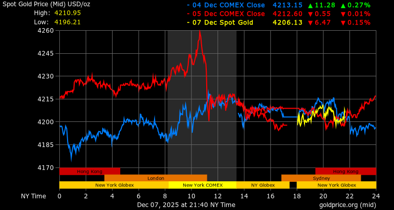 Trên thị trường vàng thế giới, giá vàng giao ngay chốt phiên cuối tuần qua tại Mỹ giảm 10,1 USD, tương ứng giảm 0,24% xuống mức 4.198,7 USD/ounce. Sang phiên châu Á sáng nay, giá vàng đảo chiều tăng 7,5 USD lên 4.206,2 USD/ounce.