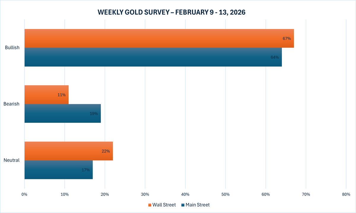 Khảo sát vàng hàng tuần mới nhất của Kitco News cho thấy Phố Wall đã lấy lại niềm tin vào sức mạnh ngắn hạn của vàng, trong khi các nhà đầu tư nhỏ lẻ vẫn giữ đa số lạc quan, nhưng vẫn cảm nhận được sự cay đắng từ những tổn thất của tuần trước.